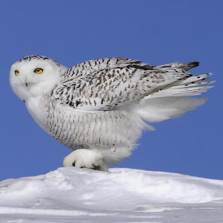 雪鸮是一種分布頗為廣泛的鳥類,也是一種大型的貓頭鷹,但與普通貓頭鷹不同的是,雪鸮是白天黑夜都能進行活動,它們全身為雪色擁有類似于巖石顏色的橫斑為它們提供了一定的隱蔽性,而瞳孔呈現(xiàn)一種金黃色,十分的威風漂亮,多見于一些凍土和苔原地帶。